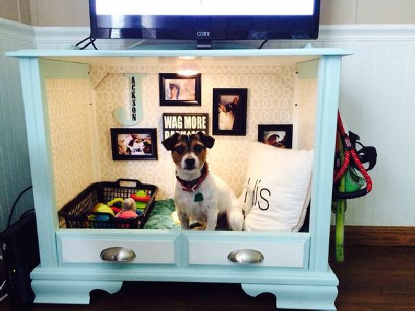 Вопрос эстетики заботит хозяина значительно больше, чем собаку, так что здесь два пути – просто убрать ненужные полочки и постелить собаке лежанку, либо привести тумбочку в надлежащий, вписывающийся в интерьер вид.