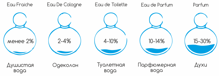 Парфюмы делятся на духи, парфюмированную или туалетную воду в зависимости от концентрации душистых веществ. В одеколонах она самая низкая — до 9%, в туалетной воде — от 9 до 15%, в парфюмированной — 15-25%, а в духах от 25% и выше. Но это деление очень условно, потому что иногда при меньшей концентрации аромат может быть устойчивее.