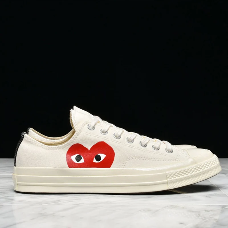 Разработанный художником-графиком Филипом Паговски и основателем Comme des Garçons Рей Кавакубоэ, Comme des Garçons x Chuck Taylor 1970 Low ‘Play’ представляет собой специальную цветовую гамму черного цвета.