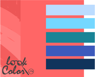 Живой Коралл с синим сочетаются, как освежающая, гармоничная пара, контраст которой привязан к тепло-холодной разнице цветов. Такая комбинация напоминает море и коралловые рифы, освежает и привлекает своей экзотикой, связью с теплым климатом, а также путешествием и отдыхом. В таблице сочетания участвуют аквамарин, нежно-голубой, бирюзовый, сине-зеленый, берлинская лазурь.