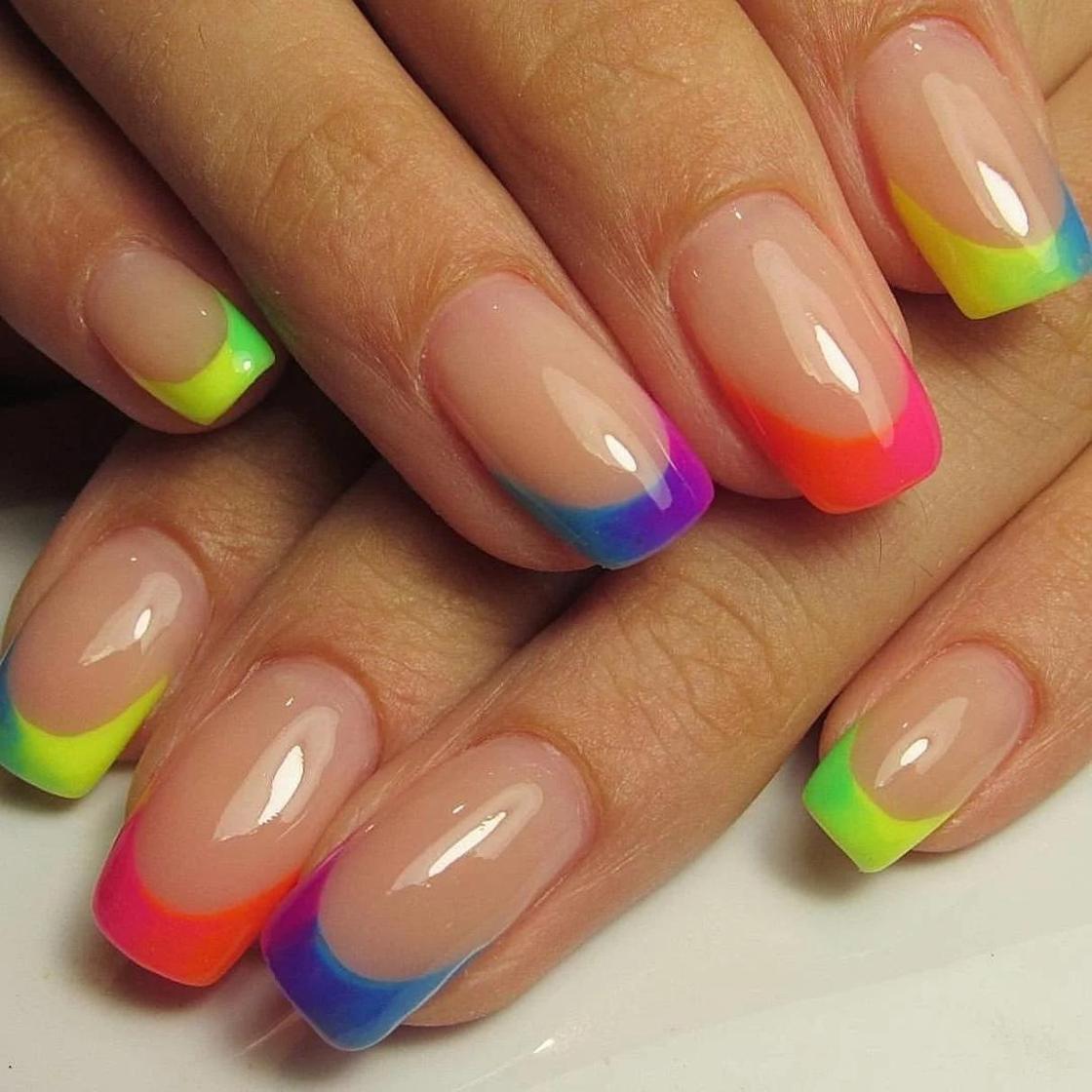 Когда заходит речь о маникюре однажды придет желание сделать нечто яркое, весенне-летнее поднимающее настроение. Решением может стать разноцветный или радужный френч. Когда яркие краски «улыбок» переходят с ноготка на ноготок. Или напоминают смешения всех цветов радуги. Такие красочные решения маникюра идеально подходят для романтического свидания.