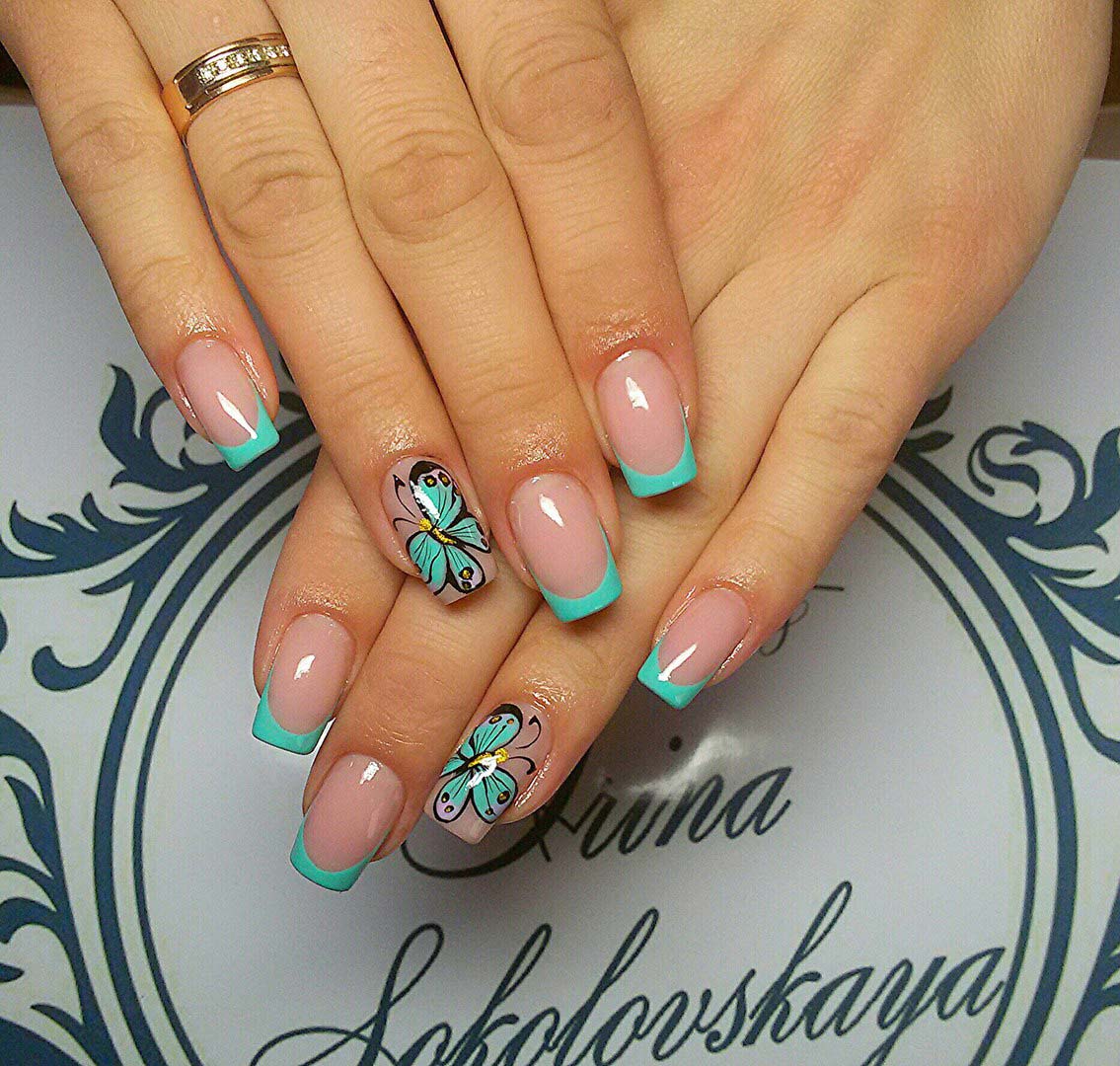 Поскольку цветной французский маникюр чаще всего достаточно яркий, его можно смело комбинировать с соответствующим рисунком. Изображение бабочек в данном случае будет смотреться невероятно красиво и лишь подчеркнет оригинальность маникюра. Чтобы дизайн выглядел реалистично, лучше всего использовать слайдер-дизайн с напечатанным рисунком. Выбранный фрагмент необходимо разместить в небольшом количестве воды буквально на минуту.
