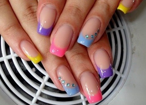 Вот уже несколько лет подряд остается актуальным разноцветный френч. Интересно, что его можно делать не только в теплое время года или для отдыха, но и для работы или повседневной жизни. Причем такой вариант может быть выполнен несколькими способами. В домашних условиях проще всего нанести разные оттенки на каждый ноготок. Это, пожалуй, самое простое и универсальное решение. Он хорошо смотрится с разными образами и точно не наскучит за несколько дней. Кстати для рабочих будней лучше выбрать пастельные тона, а для отдыха на море стоит сделать яркий френч.