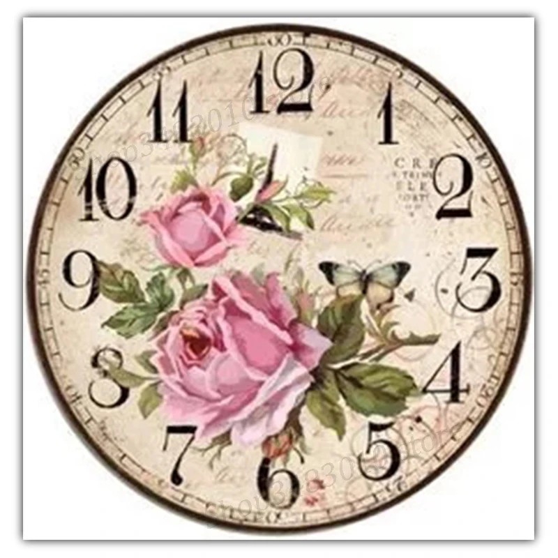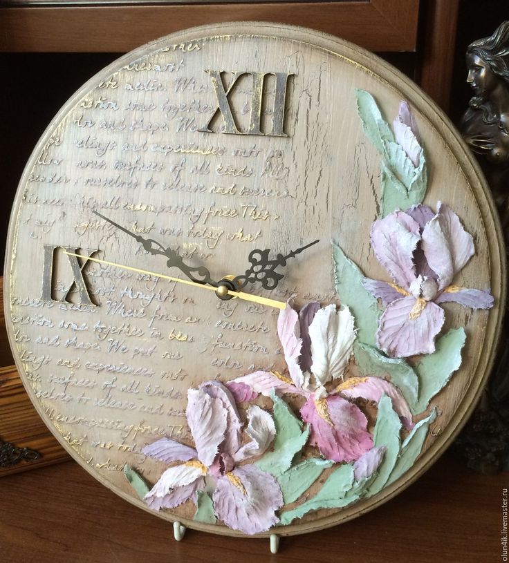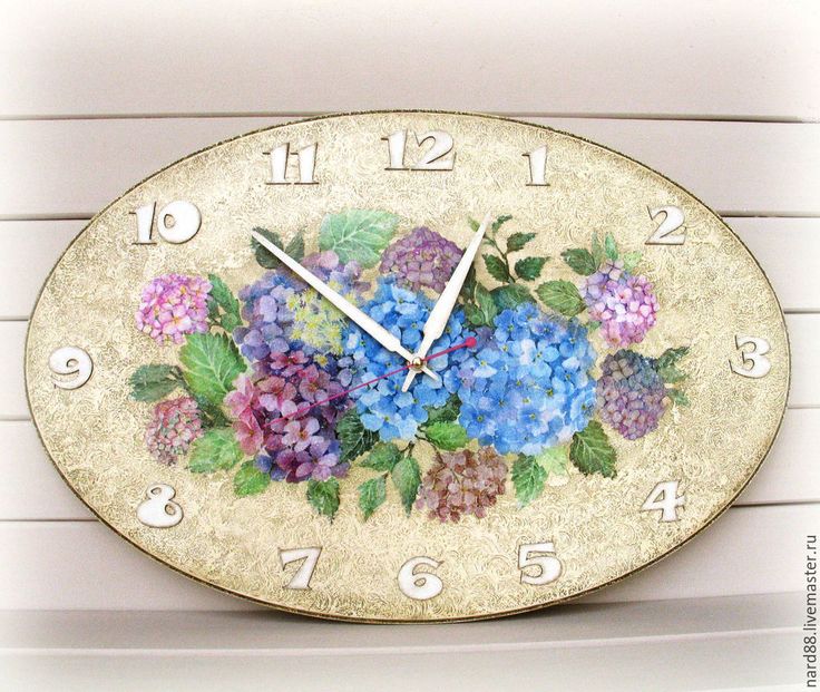 Как правило, все простые варианты декупажа выполняются на готовой основе для часов со стрелками . Мастер только определяет внешний вид, выбирает циферблат и наклеивает рисунок. Вы можете использовать такие варианты: