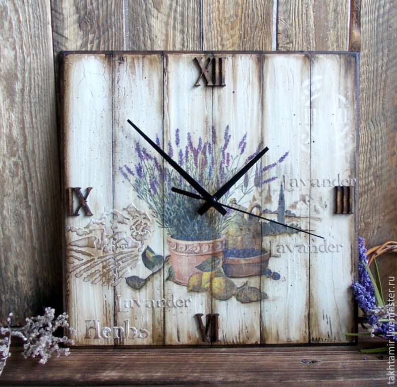 Часы в стиле прованс, которые вы найдёте в магазинах-это, конечно же, стилизация, то есть имитация стиля, характерного для прованса. Попробуйте самостоятельно вместе с мастерами сделать часы в стиле прованс. Такой способ оформления интерьера позволяет максимально точно подобрать такие элементы для вашей комнаты, которые вы не сможете купить в магазине.