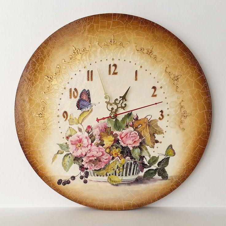 Надо отметить, что хоть декупаж невероятно красиво смотрится на миниатюрных вещах, но в случае с часами самым эффектным будет вариант декора часов большого размера.