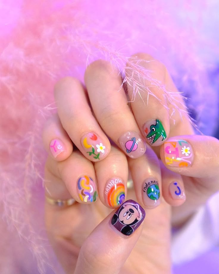 В старшем возрасте подростки предпочитают креативные рисунки, подходящие к коротким ногтям. Как правило, что несет в себе какую-либо символику или важную для них информацию. Скажем, атрибутику любимого занятия, брендов, сердечки, иконки социальных сетей или мессенджеров – всё это сегодня в тренде.