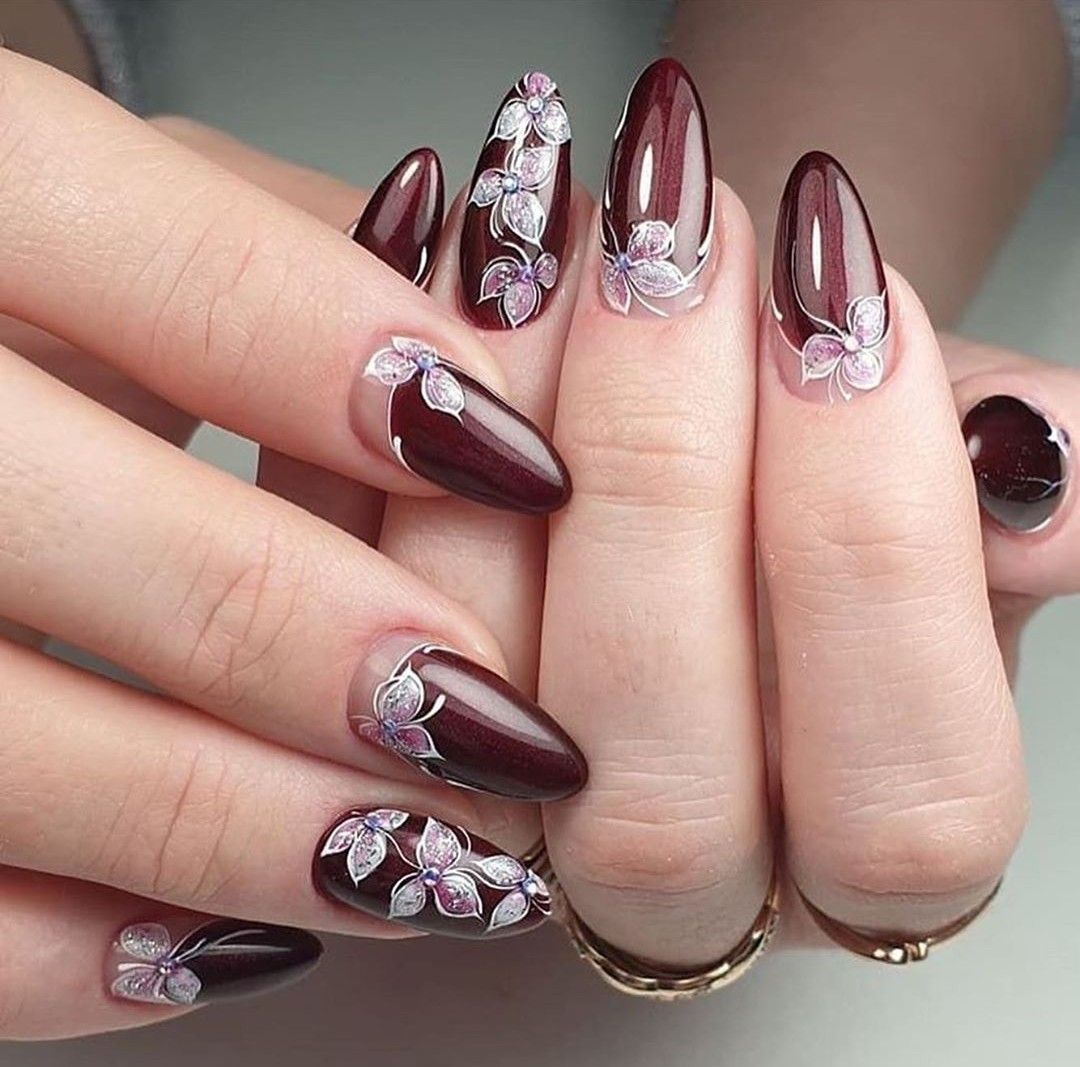 Эти ногти служат примером простого, но потрясающего образа. Нюдовый бордовый лак с некоторыми черными узорами — такая элегантная комбинация для осени.