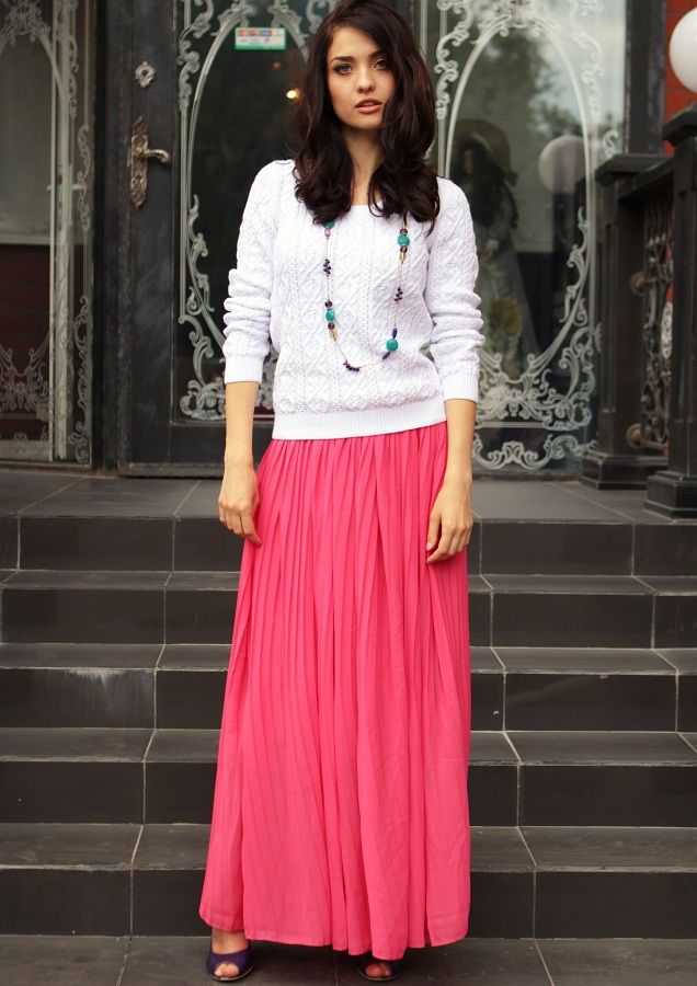Юбку макси можно смело носить с обувью на каблуке и с изделиями на плоской подошве. Обладательницы пропорциональной фигуры часто сочетают легкие шифоновые юбки в розовых тонах с белыми кроссовками и кедами.