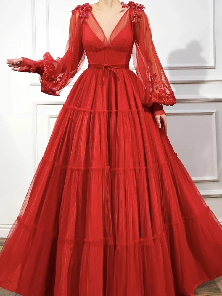 Вечернее платье в пол с длинными рукавами из шифона, гипюра. Закрытое. Красное