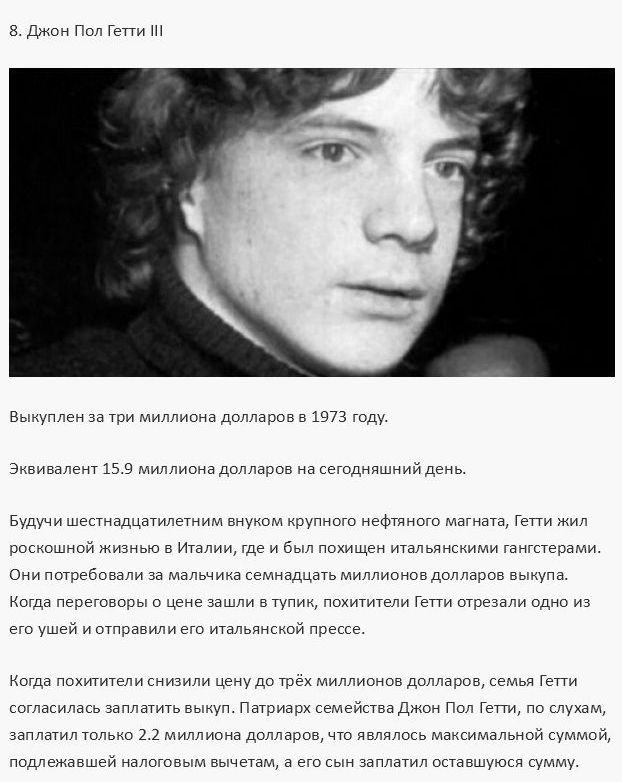 Кстати, большую часть полученных в качестве выкупа денег полиция так и не нашла. Два миллиона долларов бесследно исчезли, и, как утверждали некоторые скептики, использовались в качестве гонорара адвокатам и в виде взятки суду. Что же касается самого Пола Гетти III, то после освобождения из рук бандитов он долго лечился, перенес пластическую операцию по восстановлению уха, которое ему отрезали похитители. Затем Пол женился, у него родился сын, но психологическая травма, связанная с похищением, так и не отпустила «миллиардерского внучка». Он продолжал злоупотреблять алкоголем и наркотиками, уже в 1981 году это привело к инсульту, который сделал 25-летнего парня парализованным, глухим и почти слепым инвалидом. Скончался Гетти III в возрасте 54 лет.