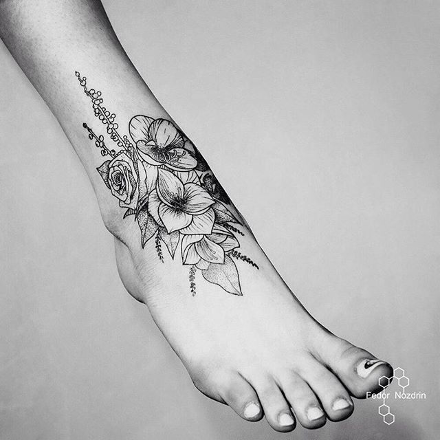 Есть несколько рисунков, которые будут отлично смотреться, когда они ниспадают с лодыжки на ступню. Это в основном относится к любым плавным по своей природе рисункам, таким как цветы, змеи, ветер или вода.