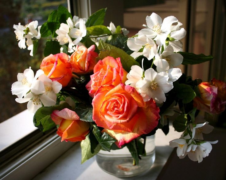 Букет белых роз на окне