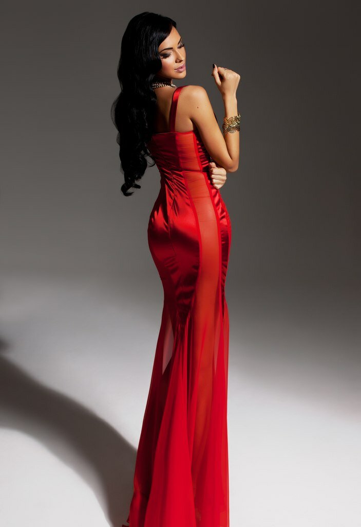 Модная модель в ротемном lang schwenkendem Luxuskleid. Dunkelhäutige…