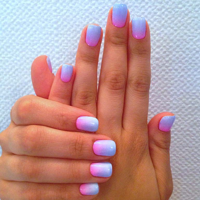 Преданной любовью пользуется техника градиент (омбре), позволяет выполнить плавный переход контрастных оттенков. Поэтому здесь лучше не делать акцент на декоре. Не бойтесь экспериментировать. К примеру, микс из мерцающих пастельных оттенков прекрасное украшение ногтей в весенне-летний период.