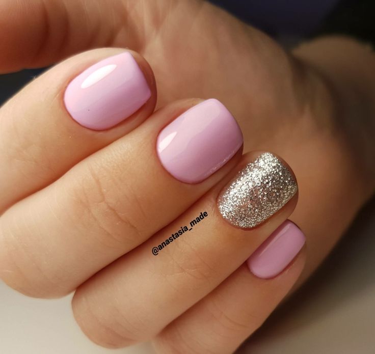 Глиттер отлично справляется с ролью главного акцента всего маникюра. Выполните сплошное покрытие ногтей серебряным глиттером, а остальные ноготки окрасьте в однотонный черный, серый, бежевый и другие оттенки. Помимо глиттера можно использовать “сахарок”, который представлен в самых разнообразных оттенках. Помимо светлых тонов в маникюрных магазинах можно встретить материал красного, синего, малинового, мятного оттенков.