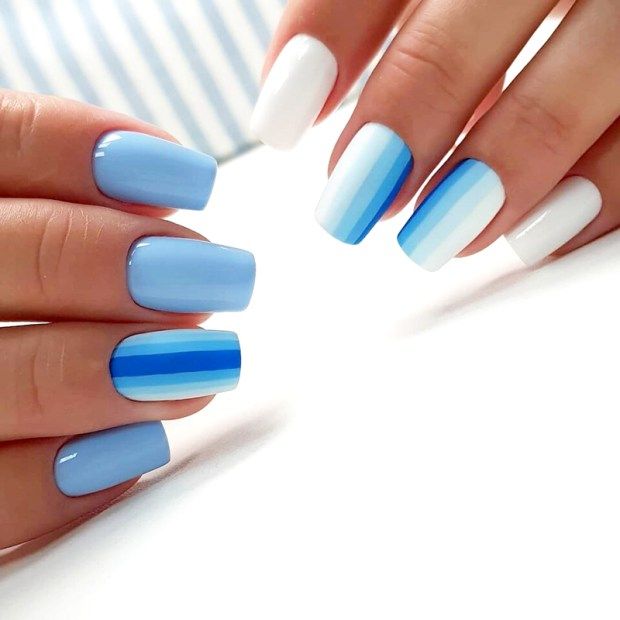 Французский маникюр подходит для ногтей любой формы и обычно его выбирают те, кто предпочитает классику. Французский маникюр с голубыми кончиками выглядит просто, но очень элегантно. Вертикальные узоры похожих цветов добавят вашему классическому дизайну особый шарм. Этот необычный маникюр подходит для повседневной носки. Кроме того, он может завершить любой выходной образ.