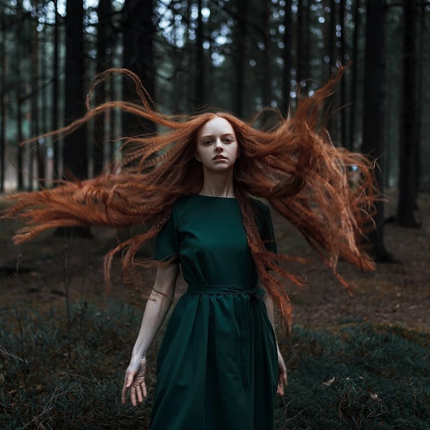 рыжеволосая девушка-демон в черном платье с капюшоном. рыжие волосы развеваются на ветру. темный густой глубокий лесной фон, деревья. склеральные линзы на глазаPREMIUM
