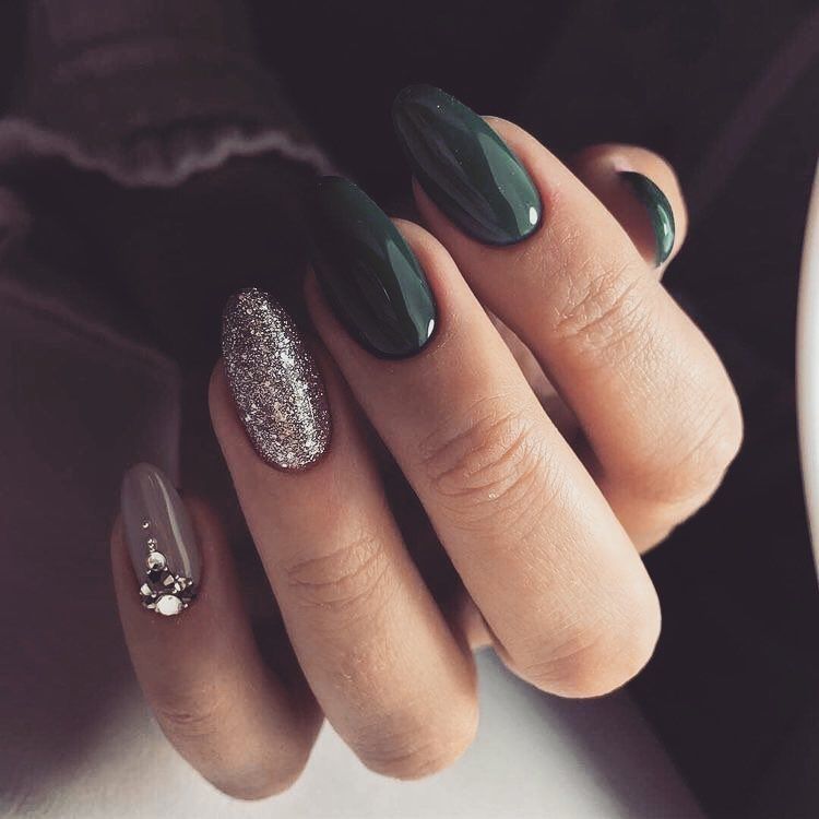 Темные оттенки в маникюре — это не всегда «скучно», ведь вы можете добавить блестки или втрику. Такая деталь сделает его интересным и добавит изюминку.
