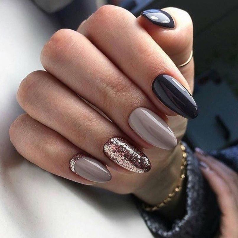 Вы можете выделить глиттером исключительно кончики или основание ногтей, а также сочетать блёстки с матовой или однородной глянцевой текстурой.