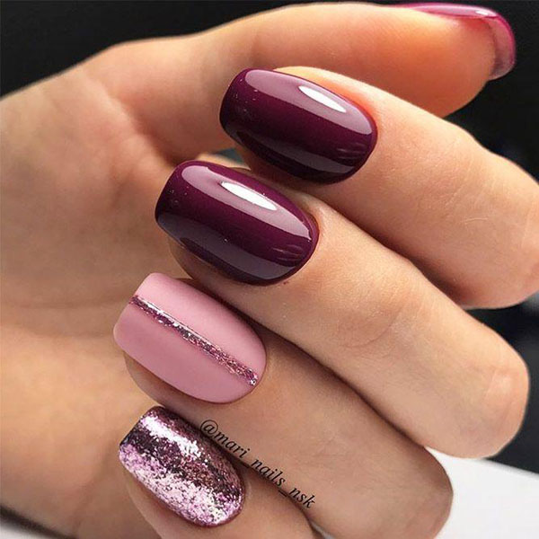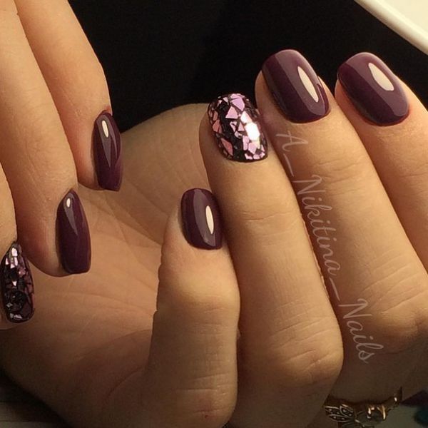 Сливовый маникюр можно делать не только в классической вариации, но и добавить блеска. Такой вариант маникюра не будет слишком блестеть и привлекать внимание, но будет более разнообразным. Блестки могут быть как под цвет лака с блестящими вкраплениями, так и совершенного другого цвета. Например, отлично будет сочетаться с оттенками розового и серебра.