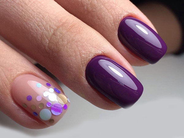 Блестки – как мы любим эти маленькие разноцветные частички, которые заставляют нас радоваться лишь только, взглянув на них. И очень хорошей идей будет добавить в сливовый маникюр, такую радость. Ваши блестки могут быть разных размеров, начиная от самой мелкой, почти пыли, до крупных крупинок.