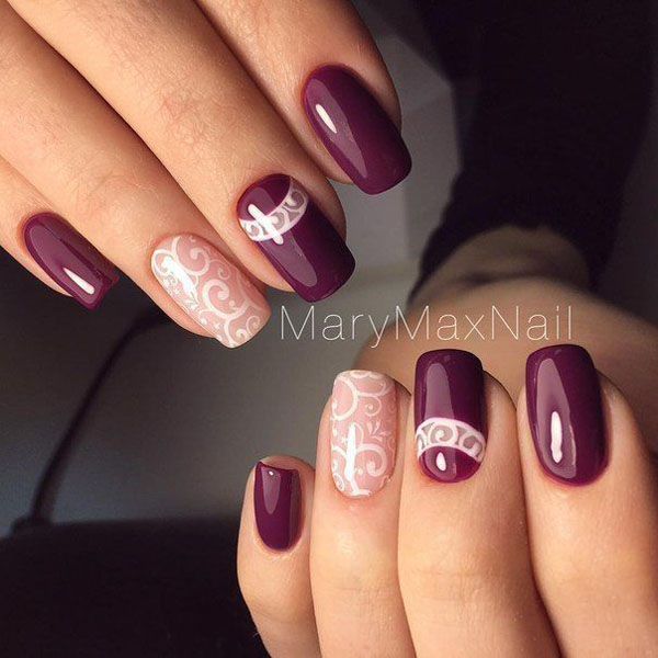 Вы девушка более консервативная и отдаете свое предпочтение классике? Тогда этот маникюр специально для вас. Приглушенный сливовый цвет в сочетании с абстрактным рисунком смотрится весьма элегантно и при этом очень стильно.