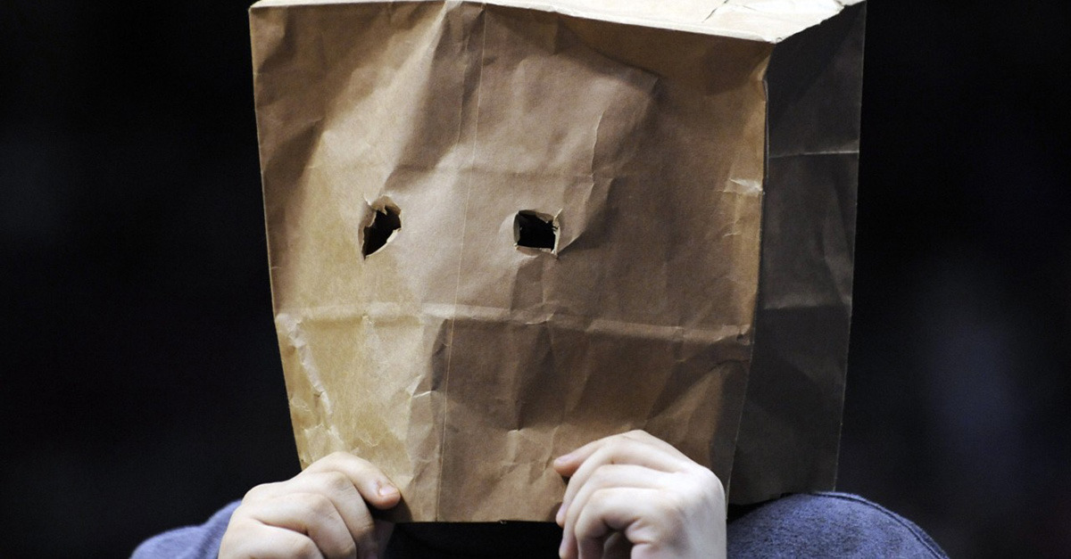 Mann trägt Papiertüte auf dem Kopf, um sich vor der Welt zu…