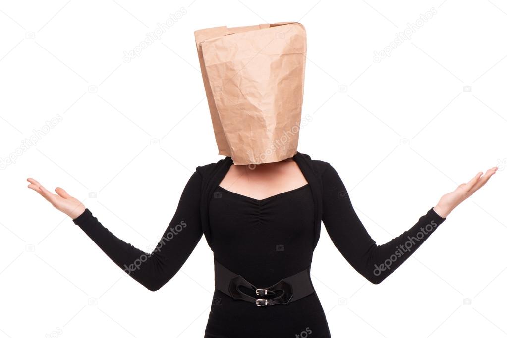Frau mit Papiertüte auf dem Kopf mit einem wütenden Ausdruck darauf