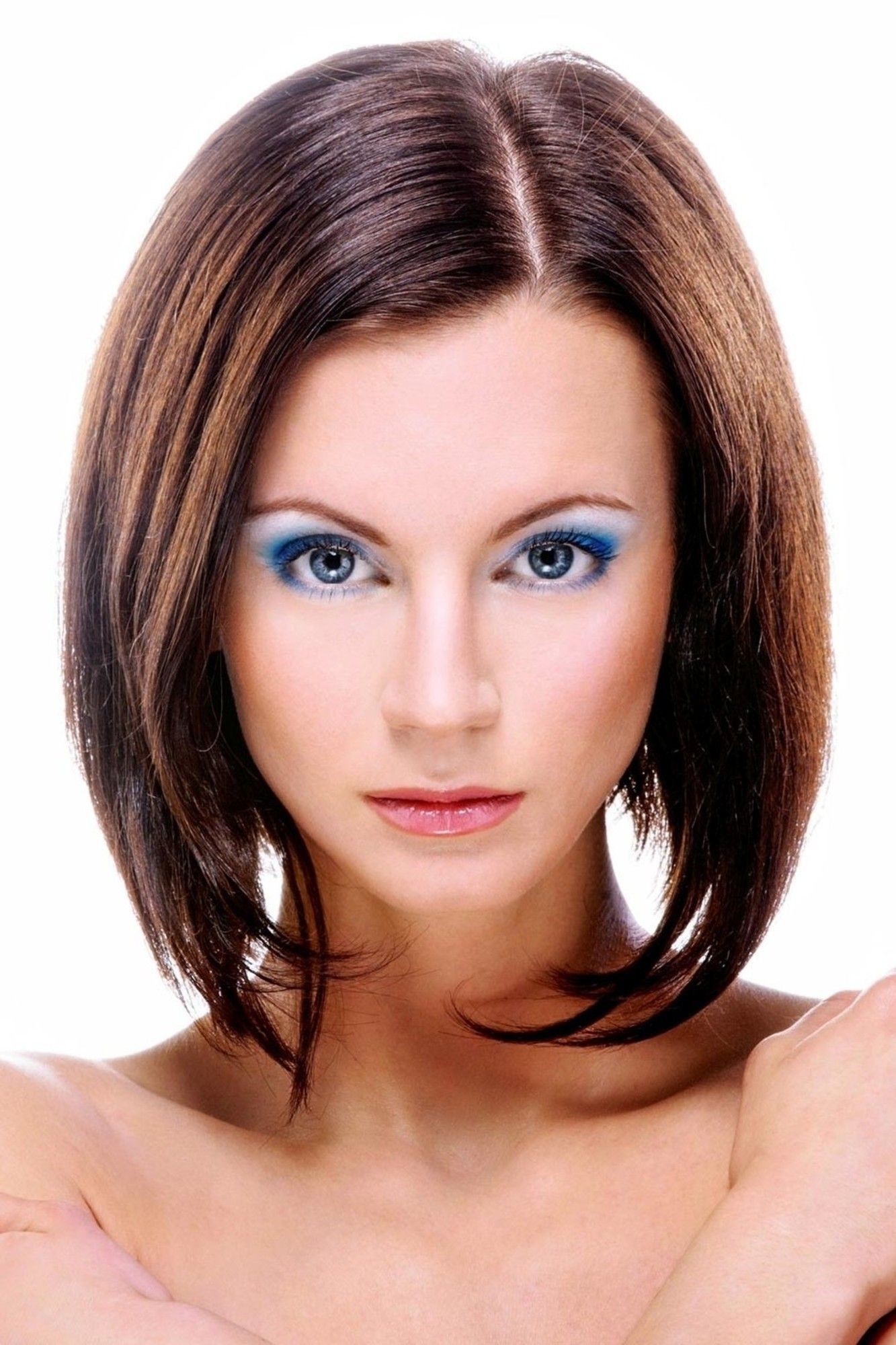 3) Боб. Стрижка на средние волосы без выстригания челки. Данная прическа также подходит многим женщинам. Не рекомендуется лишь тем, у кого очень круглое или полное лицо. Из множества различных вариантов, наиболее удачной считается многослойная стрижка боб. Таким не хитрым образом можно быстро добавить волосам недостающего объема. Особенно рекомендуется данный вариант прически тем женщинам, у которых крупные черты лица. Это позволит визуально уменьшить пропорции и сделать лицо более мягким и женственным. Укладка волос обычная и не требует каких-либо особых навыков. Для праздничного мероприятия можно разгладить волосы утюжком и слегка приподнять их на макушке. Также в волосы можно добавить различные аксессуары, подходящие для посещаемого мероприятия.