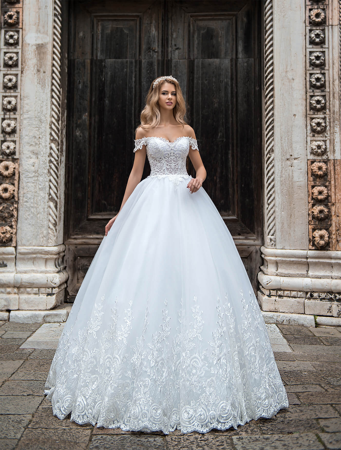 Отправляйтесь в официальный магазин, чтобы примерить это доступное свадебное платье с открытыми плечами!