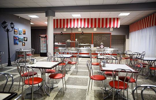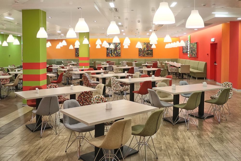 Der Speisesaal ist in einem minimalistischen Stile eingerichtet.