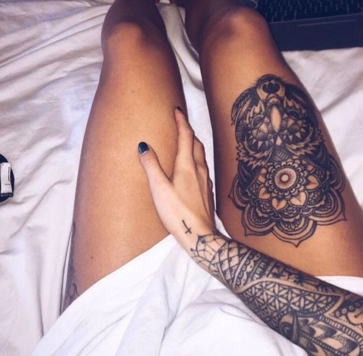 Также можно набить небольшие симметричные изображения на заднюю часть бедра. Например, одинаковые бантики или иероглифы; - Узоры. Исключительно женской татуировкой на бедре являются ажурные подвязки, выдающие игривый характер дамы. Добавить страсти изображению поможет спрятанный за подвязкой пистолет. Также данный узор набивают в сочетании с красными розами и черепами. К популярным женским узорам относятся мандалы. Они не только украшают бедро витиеватым орнаментом, но и несут в себе глубокое смысловое значение;