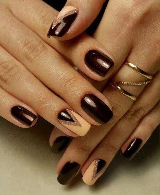 Любительницы Casual style обязательно оценят маникюр в темных тонах, в которых доминирует шоколадный оттенок. Он придает ногтям особое очаровании и изысканность. Оформление может быть любым. В качестве базы могут быть выбраны цвета «бурбон» или «латунь». С такими оттенками отлично сочетается геометрический или цветочный принт.