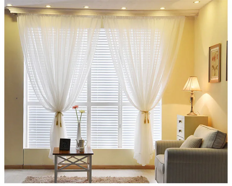 Белый тюль на рейлинге с белым потолком. украшение интерьера шторами в гостиной или спальне. комфортно жить в собственном доме.