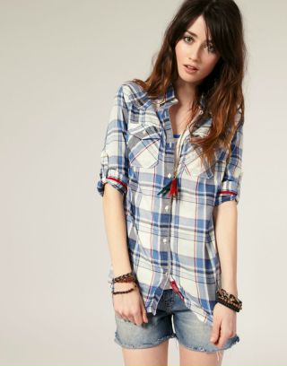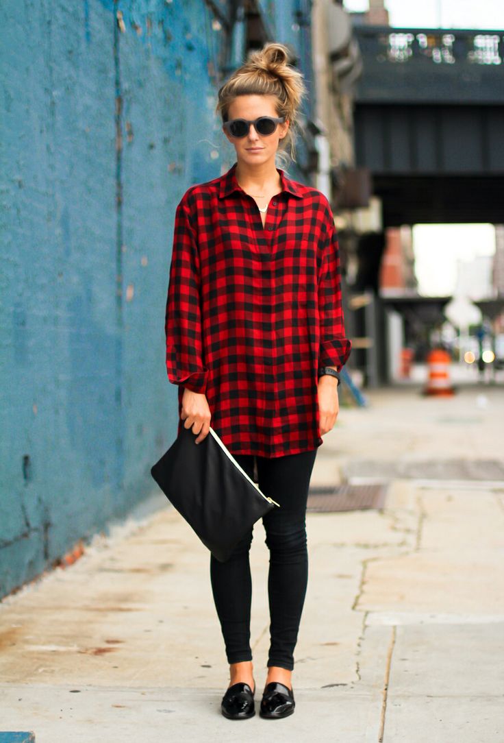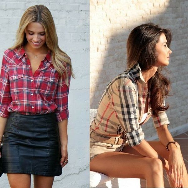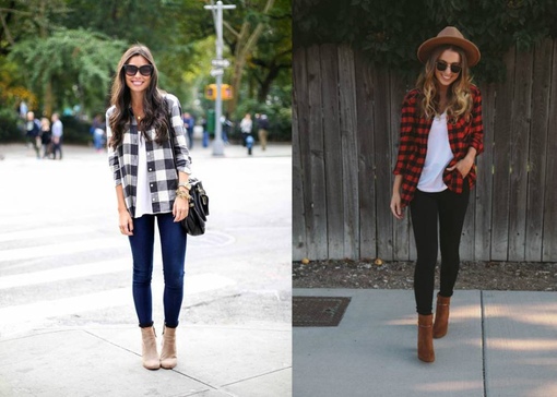 На девушках, также, прекрасно смотрятся подобные сочетания. Джинсовая рубашка с легким белым топом в сочетании со светлыми джинсами с потертостями представляет собой довольно дерзкий сексуальный образ. Его можно дополнить спортивной обувью или же модными босоножками на шпильке. А классическая клетчатая красная рубашка с черной футболкой будет хорошо смотреться с темно-синими джинсами и замшевыми ботильонами, коричневого цвета.
