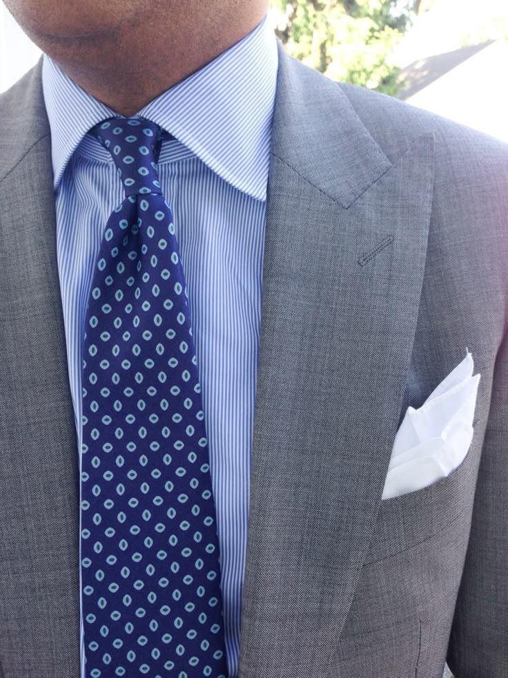 Между тем, светлые галстуки лучше сочетаются со средними и светлыми серыми костюмами. Кроме того, что касается узора галстука, имейте в виду, что чем он меньше, тем он более формальный; поскольку большие узоры всегда менее формальны, они лучше сочетаются с более светлыми оттенками серого.