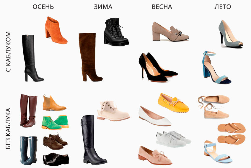 35-37. 3 пары осенне-весенней обуви: сапоги на каблуке (тоже требование, что и к туфлям), на низком каблуке и ботильоны (носятся строго под брюки или джинсы, иначе визуально укорачивают ноги и смотрятся нелепо).