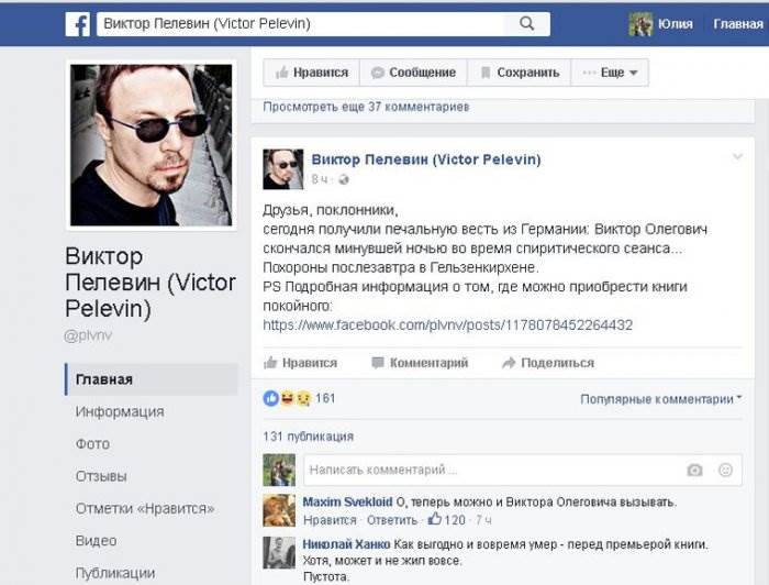 А есть еще миф о том, что Пелевин и вовсе умер 11 сентября 2016 года, а под его именем сейчас пишут другие люди. Откуда такой слух? А дело в том, что сообщение о его кончине в тот день появилось на фан-странице писателя в Facebook, и многие ему поверили. Опровержения о смерти со стороны самого Пелевина не поступало, но в «ЭКСМО», издающем его книги, тогда заявили, что информацию о кончине не подтверждают.