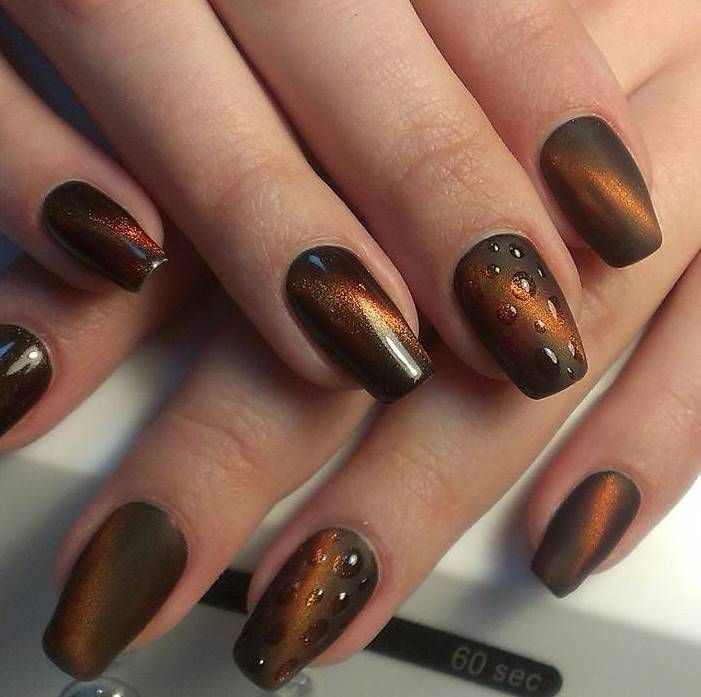 Коричневый. У многих осень ассоциируется с душистым кофе и горьковато-сладким шоколадом, поэтому «вкусные» оттенки – коричневый, бежевый. Цвет сливок будет как нельзя более уместным. Такой маникюр прекрасно смотрится с втиркой или песком. Замечательно смотрится оформление ногтей кристаллами. Выбор конкретного тона зависит от цвета кожи. Смуглым барышням стоит обратить внимание на темные оттенки коричневого, а белокожим дамам – отдать предпочтение светло-коричневому цвету, оттенкам кофе с молоком.