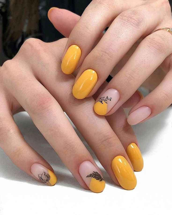 Уже неотъемлемыми рисунками в осеннем нейл-дизайне стали листья в множественных вариациях в желто-оранжевой гамме или черные на нейтральном фоне.