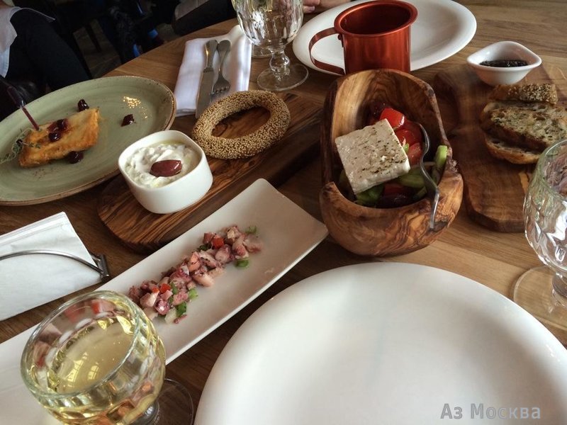 Кухня ресторана греческая в современной интерпретации. Шеф-повар отдает предпочтение вкусам искушенной московской публики, которая любит легкую и полезную пищу. В составе блюд всегда много овощей, оливки и оливковое масло, сыры разных сортов, интересные заправки для салатов, морепродукты и легкая выпечка. В ресторане есть летняя терраса, один большой обеденный зал на 88 мест. Воспользоваться скидкой в 20% можно заказав бизнес-ланч днем, а вечером посидеть с друзьями или пригласить на романтический ужин свою девушку. Для посетителей с детьми есть специальное меню, а также предлагается возможность увлечь их рисованием.
