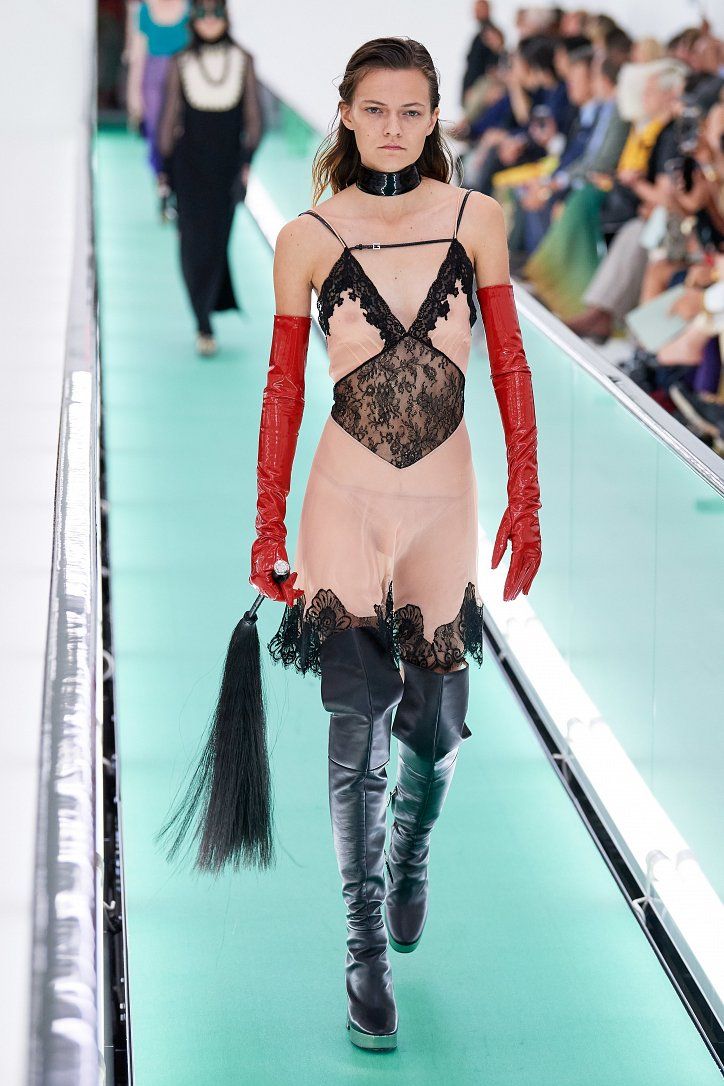 Что касается одежды, то это действительно коллекция противоречий. Оборки и цветочные мотивы в одном образе, за которыми следует дерзкий кожаный ансамбль; платья с чопорными воротниками Пьеро, но с самым коротким подолом; огромные вязаные вещи с напуском, а затем сшитые на заказ блейзеры с зазубренными лацканами.