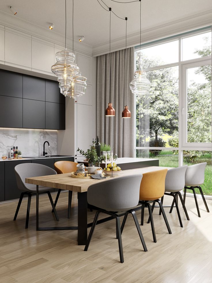 Над обеденным столом можно разместить одну люстру или низкий подвесной светильник — это поможет создать действительно уютную атмосферу.