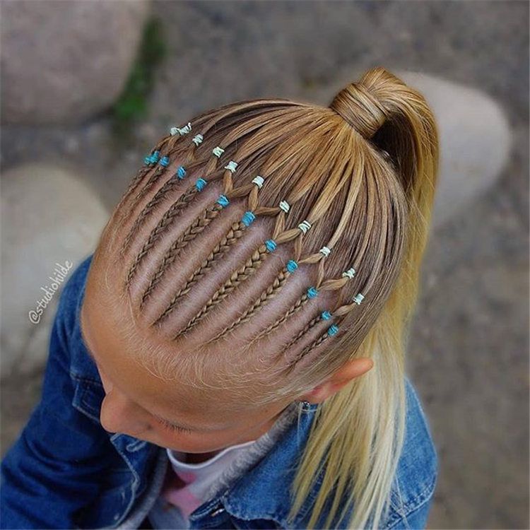 Это элементарная прическа на каждый день. Но при этом интереснее, чем обычный хвост или коса. Это отличная идея, когда вы опаздываете, но все же хотите добавить немного стиля. Используйте цветные резинки, подходящие по цвету к одежде ребенка (ссылка), или выберите праздничные тематические цвета для праздника.