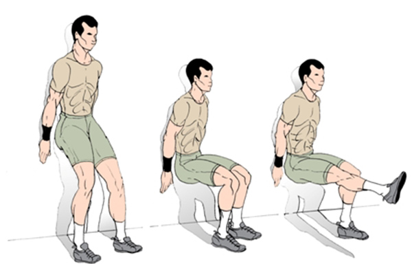 Положение вашего тела должно напоминать ту же позу, в которой вы сидите на стуле. - Задержитесь в этом положении на 15 секунд или дольше. Обязательно держите бедра и плечи в контакте со стеной и держите колени над лодыжками.