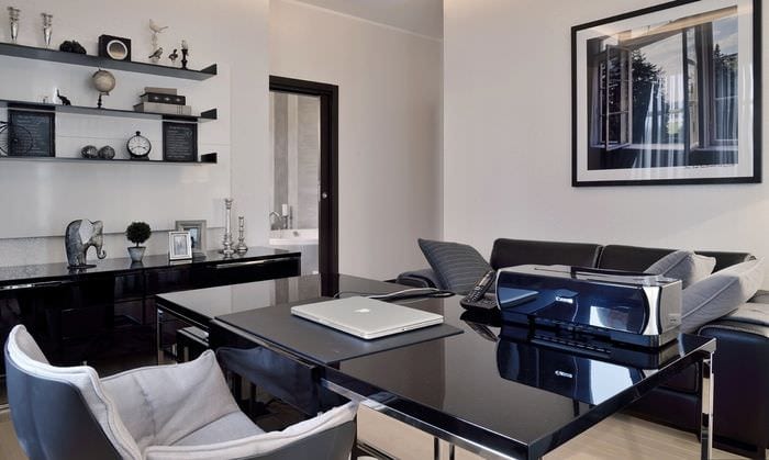 - Хай-тек. Для данного оформления характерно использование всех современных достижений технического прогресса. В оформлении доминируют различные сочетания металла, пластика и стекла. Интерьер в стиле хай-тек достаточно аскетичен. Он может быть обустроен в светлых или темных оттенках. Характерные цвета для этого интерьера – все оттенки черного, серого и белого. Будет уместно обставить такой кабинет соответствующей мебелью: металлический стеллаж в цвет стен не будет утяжелять пространство, а журнальный столик со стеклянной столешницей как бы растворяется в воздухе. Хай-тек хорош тем, что одинаково подойдет как для просторного, так и для маленького помещения.