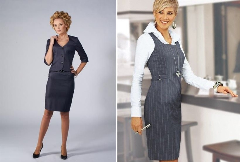 Дополнить костюм необходимо элегантной рубашкой. Это могут быть стильные модели с большими бантами, либо простого кроя, не перегруженные деталями – все зависит от вкуса модницы. Недопустимы глубокие вырезы, открытые плечи, принты, выбивающиеся из делового стиля (леопардовая или яркая тропическая расцветка) При подборе элементов гардероба следует учесть, что они должны сочетаться друг с другом – в этом случае из ограниченного набора вещей вы сможете создавать несколько вариантов. Очень современно, но в то же время строго выглядят сарафаны: длиной до колена, из плотной дорогой ткани, одетые вместе с красивой блузкой, они выгодно подчеркнут достоинства фигуры.