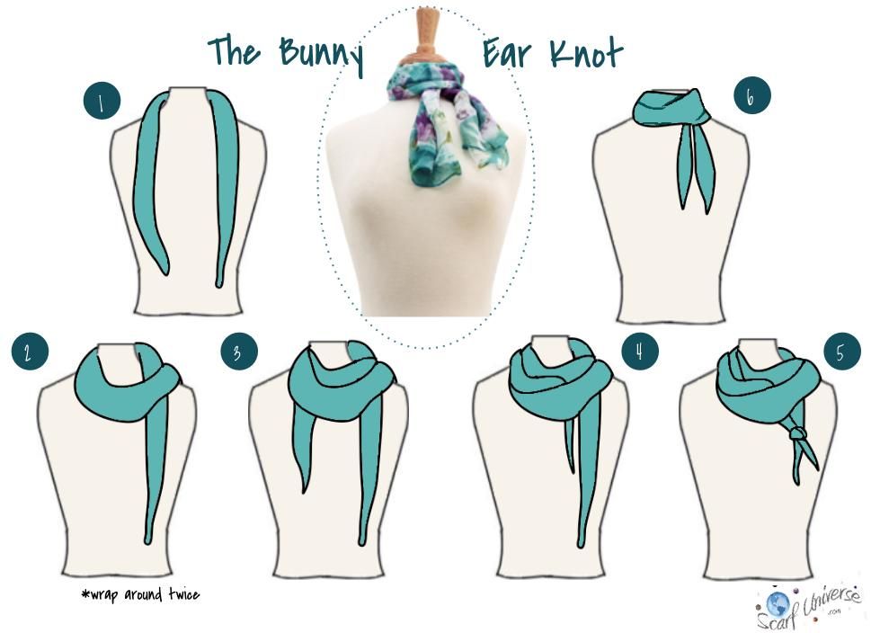 Расположите центр шарфа на передней части шеи, оберните концы вокруг шеи и сзади вперед. Затем свяжите концы вместе и завяжите один конец в петлю, как «заячьи ушки» на шнурках.