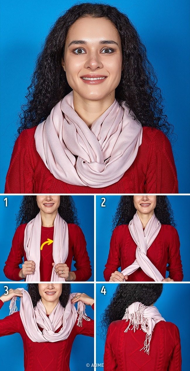 Простой и, по мнению многих, самый теплый шарф из когда-либо созданных , скрытый узел согревает шею и грудь, не пропуская сквозняков.Как ты это делаешь? Накиньте шарф на шею спереди так, чтобы его концы свешивались назад через плечи. Затем скрестите концы друг с другом и выведите вперед, закончив свободным узлом, заправленным под переднюю часть шарфа.